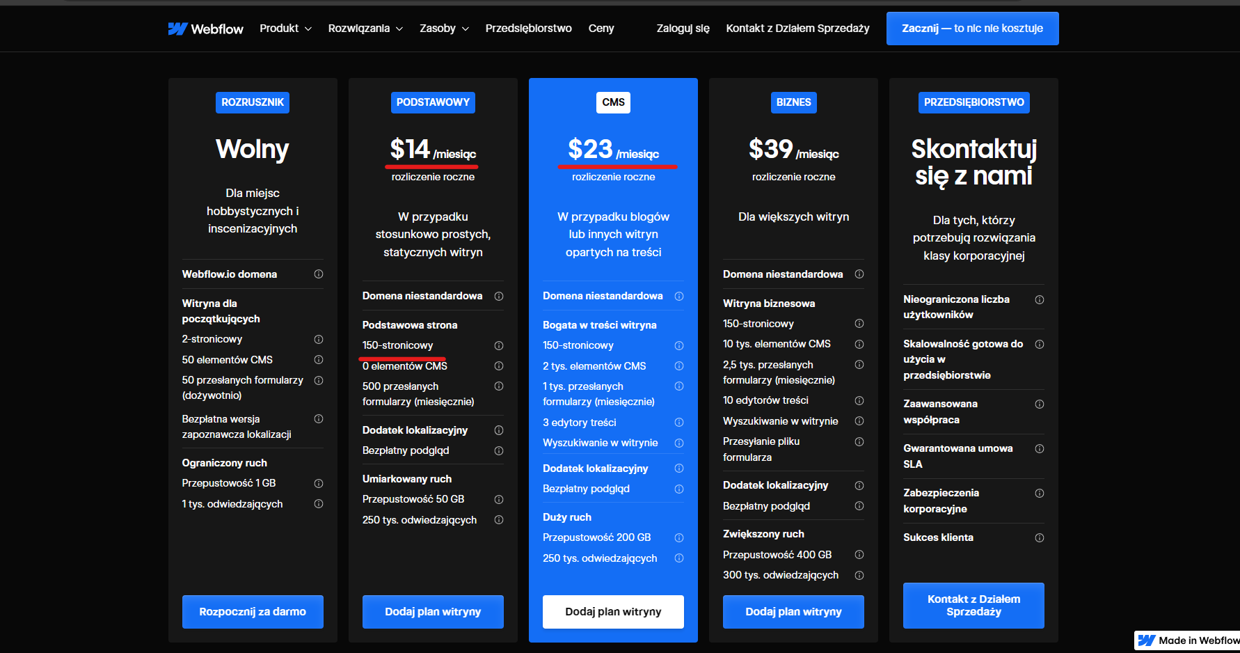 Jak możesz zobaczyć na zdjęciu, lepiej jest wykupić tańszy plan na webflow w celu prowadzenia Bloga. Oferta Podstawowa pozwala Ci założyć łącznie ~150 Podstron na Bloga! Natomiast współpracując z nami, uzyskasz jeszcze tańszy dostęp do prowadzenia Bloga ;)